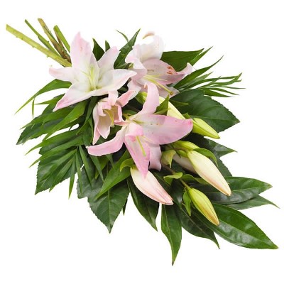 Une délicate gerbe funéraire composé de lys rose disposés sur fond de feuillage vert. Ce magnifique bouquet funéraire dégage un sentiment de sérénité et de grâce, offrant une tendre expression de sympathie et de réconfort. Magnifique, mais très abordable, cet arrangement funéraire est l'une de nos compositions de condoléances au meilleur rapport qualité-prix.