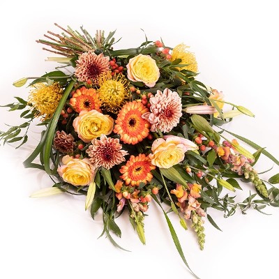 Un bouquet chaleureux pour un moment douloureux. Exprimez vos condoléances avec des roses, des chrysanthèmes et des gerberas dans des tons radieux d'orange, de jaune et de pêche.